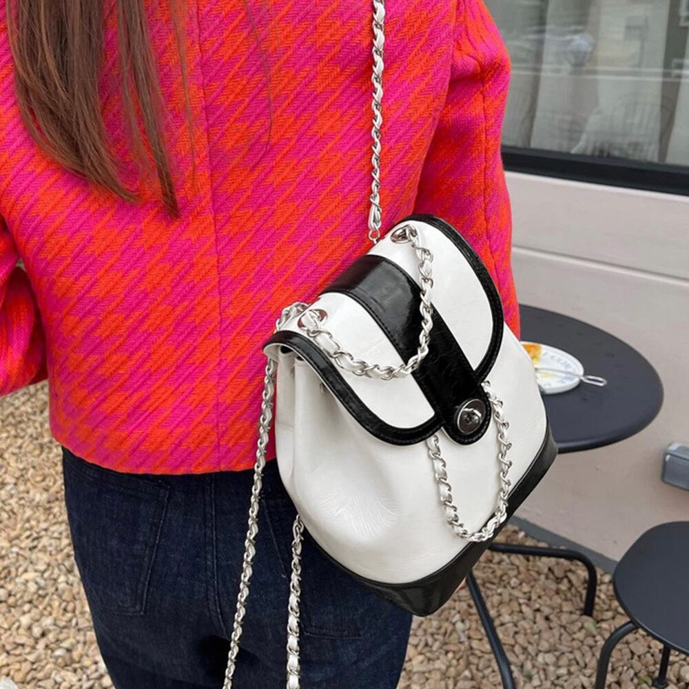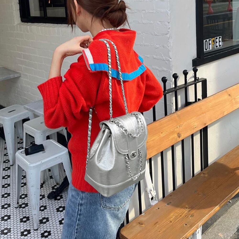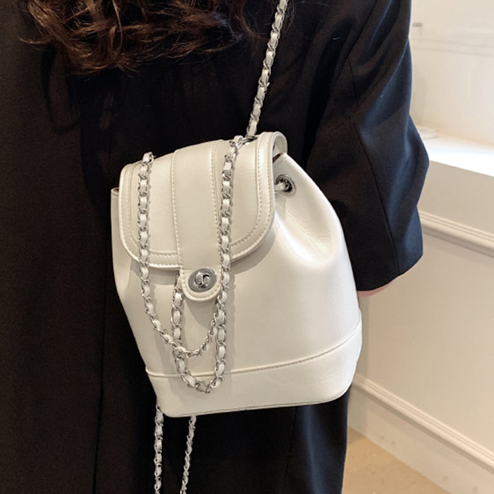 チェーンショルダーがトレンド感満載で大人可愛いフェイクレザー素材のミニリュック