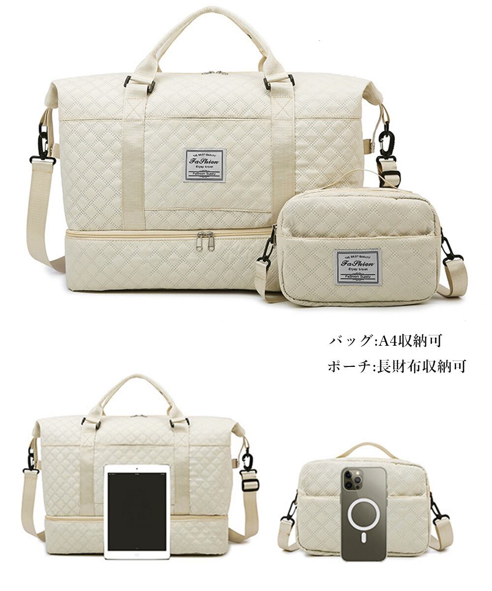 ボストンバッグには1~2泊程度の荷物、ショルダーバッグには化粧道具やスマホ、お財布などをたっぷり収納して持ち運べる